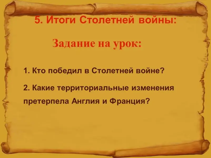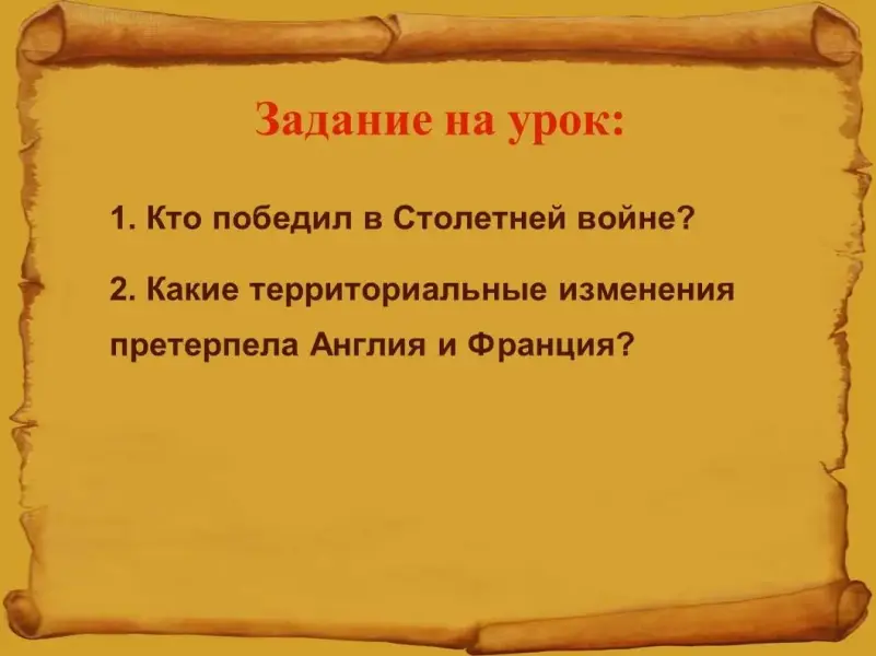 Задание на урок: В течение урока мы с Вами постараемся ответить на следующие вопросы: Кто победил в Столетней войне? Какие территориальные изменения претерпела Англия и Франция?