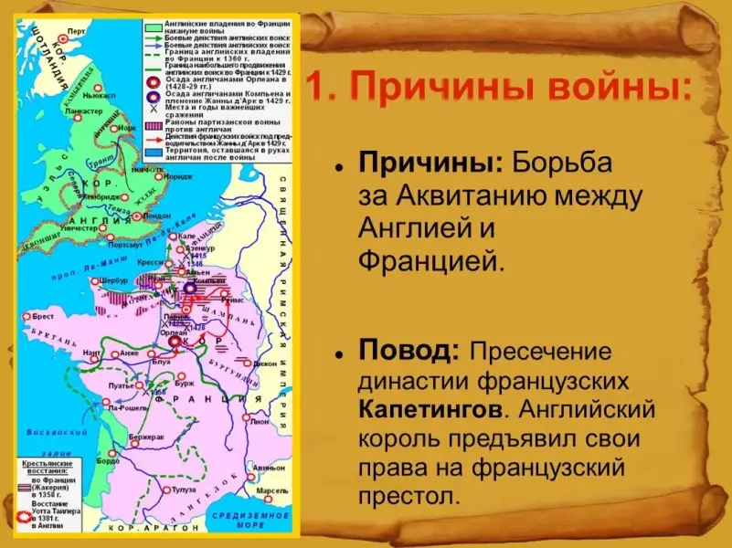 Причина: Французский король Филипп VI стремился отвоевать у Англии Аквитанию: без этого не могло завершиться объединение Франции. Но Аквитания была ценным источником доходов, и английский король Эдуард III не желал терять ее.