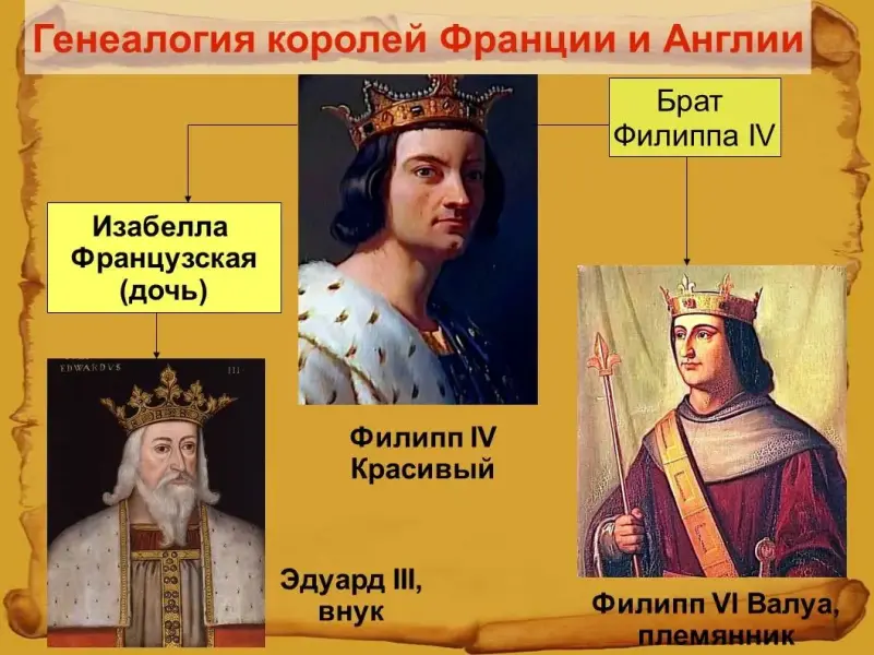 Повод: Английский король был родственником короля Франции: его мать, Изабелла Французская, была дочерью Филиппа IV Красивого. Используя то, что после смерти сыновей Филиппа IV, которые не оставили наследников, стала править новая династия Валуа, он заявил о своих правах на французский престол и начал войну. [Вопрос классу: Какая династия правила на тот момент в Англии? Ответ: династия Плантагенетов.] Несмотря на то, что по древним франкским законам женщинам запрещалось как наследовать корону, так и передавать эти права своим потомкам.