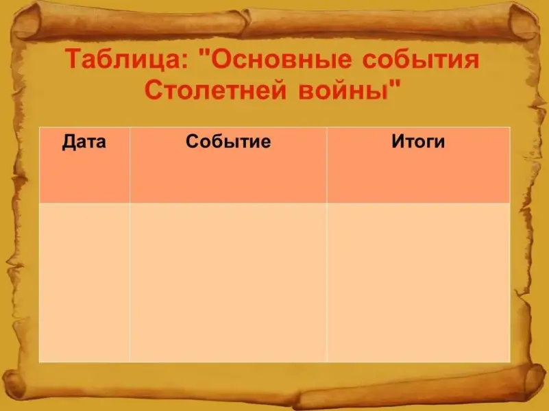 - составления и заполнения таблиц на примере таблицы "Основные события Столетней войны";