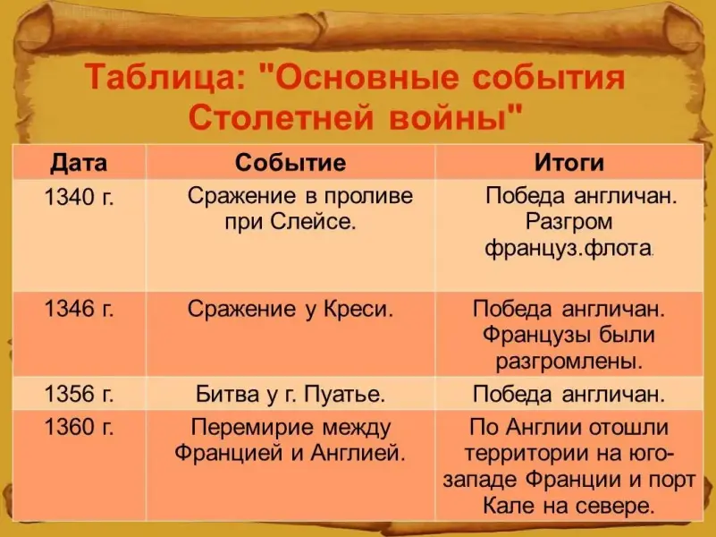 | 1360 г. | Перемирие между Францией и Англией. | К Англии отошли территории на юго-западе Франции и порт Кале на севере. |