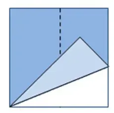 2 Затем, делаем второй сгиб, посмотрите на рисунок, мы загибаем угол квадрата таким образом, чтобы вершина квадрата, она обозначена точкой совпала с линией первого сгиба.