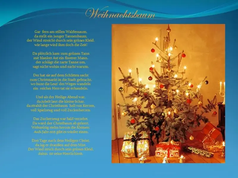 Ведущий Die Deutschen haben viele Lieder und Gedichte über Tannenbaum geschrieben. Wollen wir einige von ihnen hören.