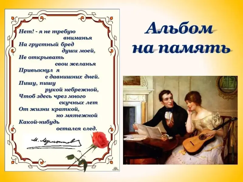 3 слайд Учитель: Во времена Лермонтова были популярны поэтические альбомы. Это тетради. В них - красиво оформленные страницы. В такие альбомы записывали пожелания, дружеские послания, любовные признания в стихах.