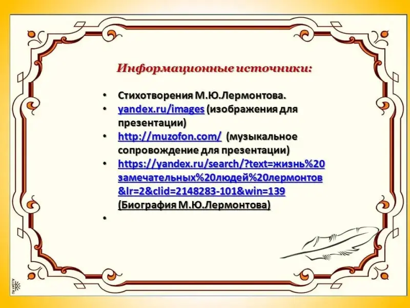 Учитель: Сегодня в нашем зале совершилось маленькое чудо, стихи Михаила Юрьевича Лермонтова звучали со сцены, они оживали, благодаря Вам, наши талантливые исполнители, благодаря вам, внимательные слушатели, благодаря вам, мои дорогие соведущие.