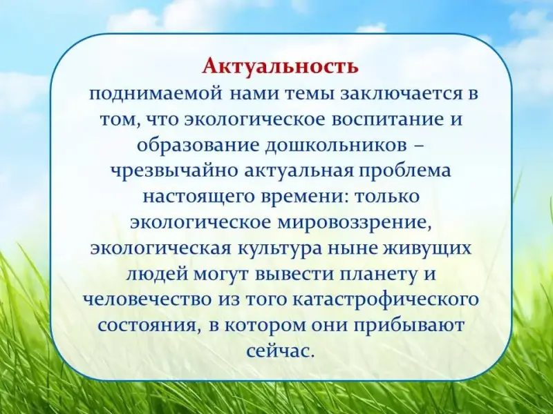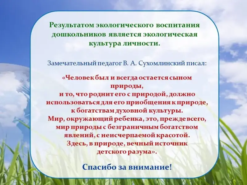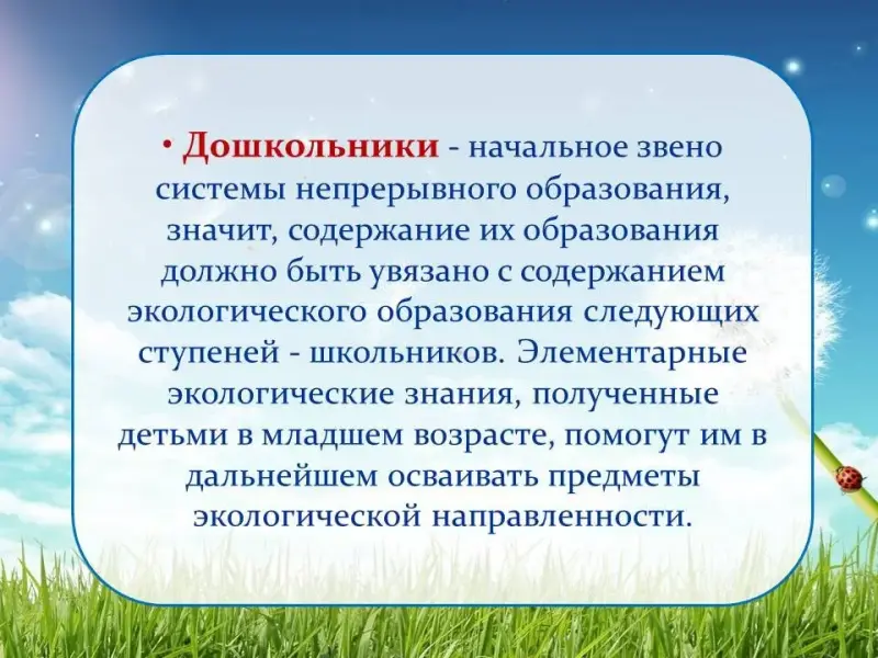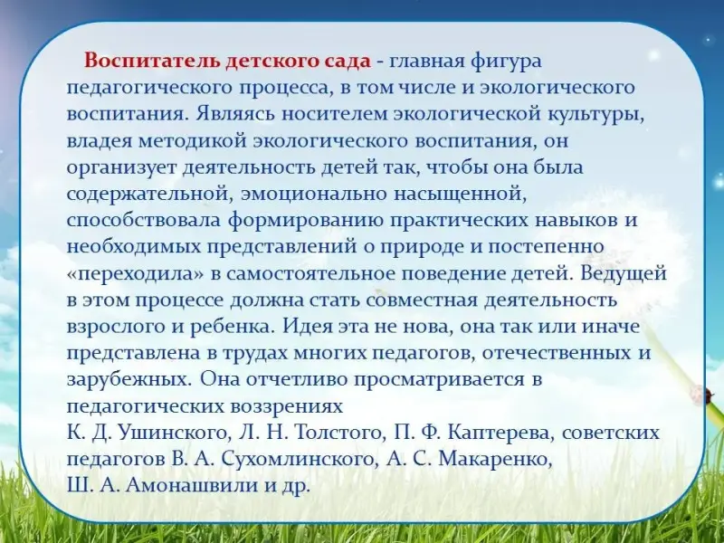 "Экологическое воспитание" предполагает осуществление перспективно-преемственных связей ДОУ и школы, распространение опыта деятельности детского учреждения среди ДОУ города, края.