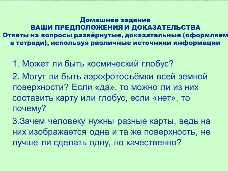 1. Может ли быть космический глобус? 2. Могут ли быть аэрофотосъёмки всей земной поверхности? Если "да", то можно ли из них составить карту или глобус, если "нет", то почему? 3. Зачем человеку нужны разные карты, ведь на них изображается одна и та же поверхность, не лучше ли сделать одну, но качественно? |