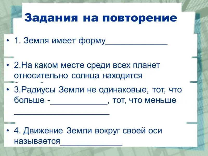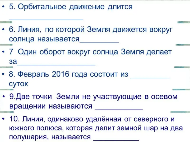 1. Земля имеет форму... 2. На каком месте среди всех планет относительно солнца находится Земля? 3. Радиусы Земли неодинаковые, тот, что больше - ..., тот , что меньше.... 4. Движение Земли вокруг своей оси называется... 5. Орбитальное движение длится... 6. Линия, по которой Земля движется вокруг солнца, называется... 7. Один оборот вокруг Солнца Земля делает за.... 8. Февраль 2016 года состоит из..... суток 9. Две точки Земной поверхности, не участвующие в осевом вращении, называются.... 10..Линия, одинаково удалённая от северного и южного полюса, которая делит земной шар на два полушария, называется... |