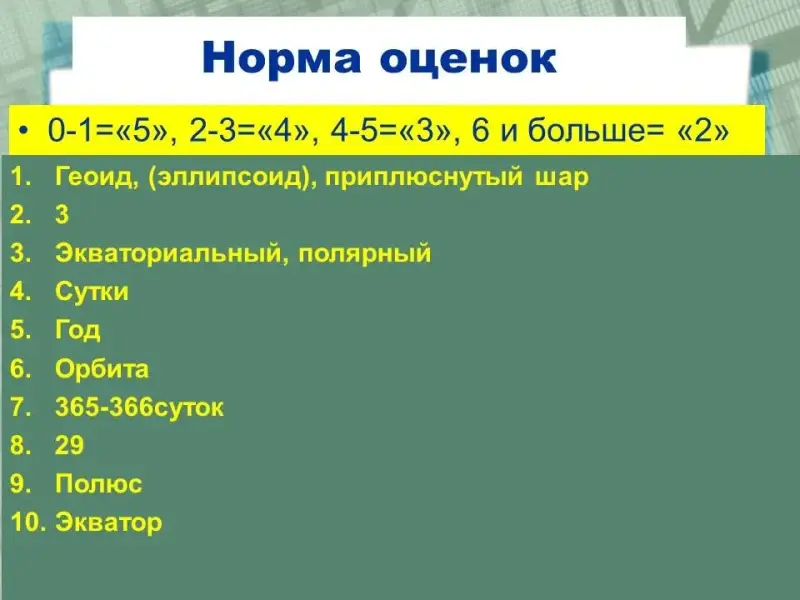 1. Геоид (приплюснутый у полюсов шар) 2. 3 3. экваториальный, полярный 4. осевое (суточное) 5. 365 - (366 суток) 6. орбита 7. год 8. 29 9. полюса 10. экватор 2. Обмениваются тетрадями с соседом по парте (взаимопроверка, оценивание) |
