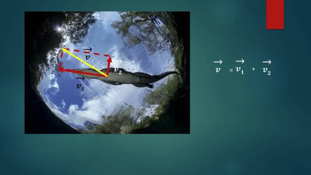 Рассмотрим пример физической задачи на сложение векторов (слайд 9). "Крокодил переплывает реку перпендикулярно берегу. Скорость, с которой он гребет равна