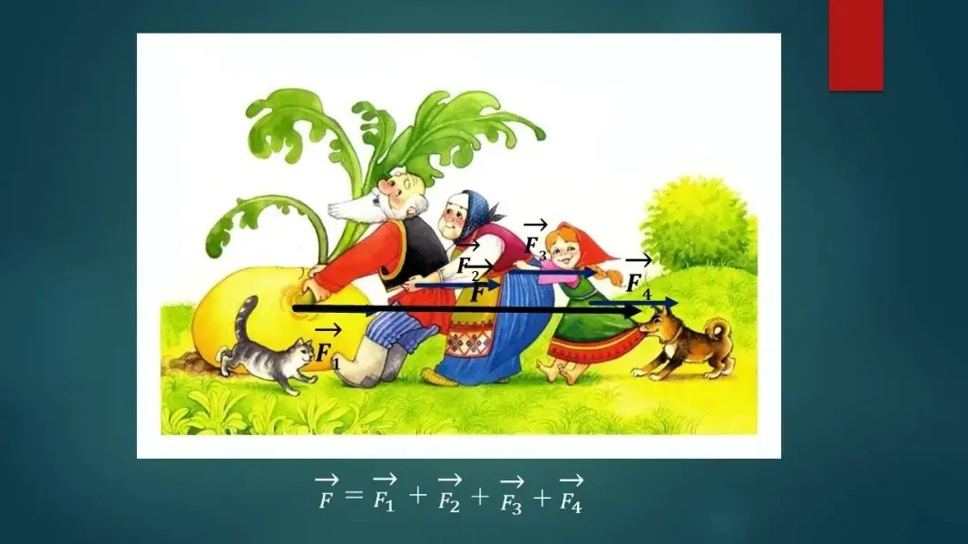 В курсе физики 7 класса вы находили равнодействующую сил, действующих на тело. Давайте вспомним как складывать и вычитать вектора, направленные вдоль одной прямой (слайд 10). Приведу пример из сказки про репку. (слайд 11) |