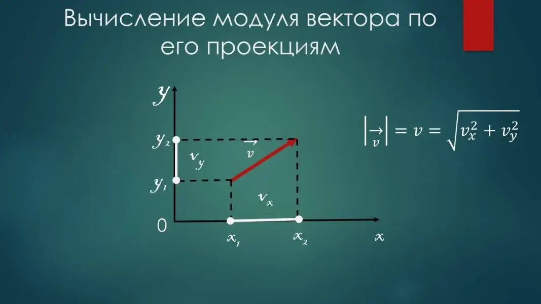 | Теперь перейдем к нахождению проекций вектора на оси координат. Учитель дает определение проекции и объясняет, как найти проекцию вектора на оси координат и модуль вектора (слайд 12, 13). |