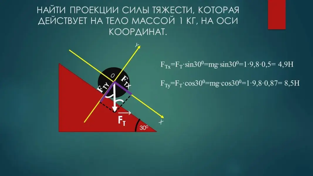 | Решим задачу (слайд 14). "Найдем проекции силы тяжести, которая действует на тело массой 1 кг, на оси координат." После того как учащиеся получили ответ, учитель показывает правильное решение данной задачи. | Учащиеся решают задачу | ||