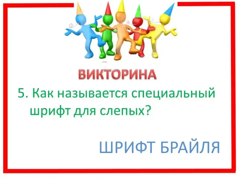 5). Как называется специальный шрифт для слепых? (шрифт брайля)
