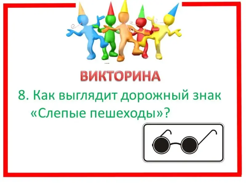 8). Как выглядит дорожный знак "Осторожно, слепые пешеходы!"? (темные очки)