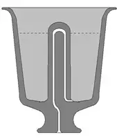 Чаша Пифагора (Рисунок 2) выглядит как обычная кружка для питья, но устроена как сифон. В центре кружки находится колонка, внутри которой проходит вертикальный канал, изогнутый вдвое. Канал изгибается в верхней части колонки и двумя концами опускается вниз, ко дну кружки. Оба конца выходят отверстиями в дне кружки, только один конец - внутрь кружки, у её дна, а второй конец - наружу кружки, насквозь через дно. Дно изготовлено толстым, таким образом между выходными отверстиями имеется разница по высоте в несколько сантиметров.
