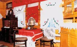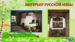 Проводит упражнение "Что где?". Предлагает рассмотреть картину с изображением интерьера татарской избы и составить предложение по ней, ответив на вопрос "Что где находится?"