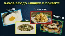 Проводит электронную игру "Четвертый лишний". Предлагает из нескольких блюд выбрать одно и объяснить - почему оно лишнее.
