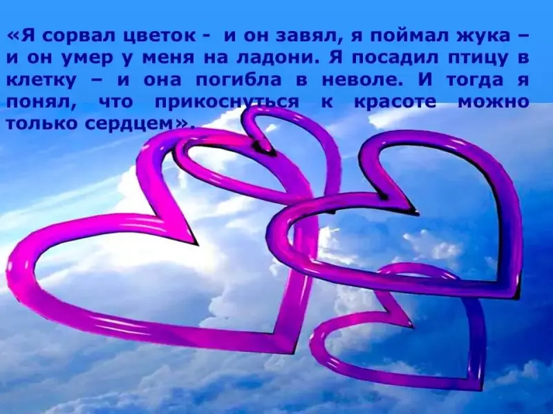 Слайд 8 - Закончить наш классный час я хочу словами словацкого поэта Павла Гвездослава: "Я сорвал цветок - и он завял, я поймал жука - и он умер у меня на ладони. Я посадил птицу в клетку - и она погибла в неволе. И тогда я понял, что прикоснуться к красоте можно только сердцем". Я желаю, чтобы к красотам нашего дома, нашей неповторимой хрупкой Земли, вы прикасались только добрым сердцем. Рефлексия Слайд 9 |