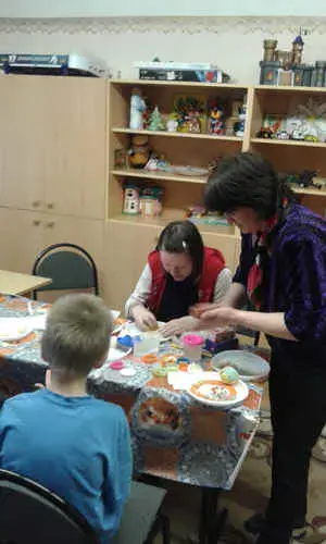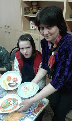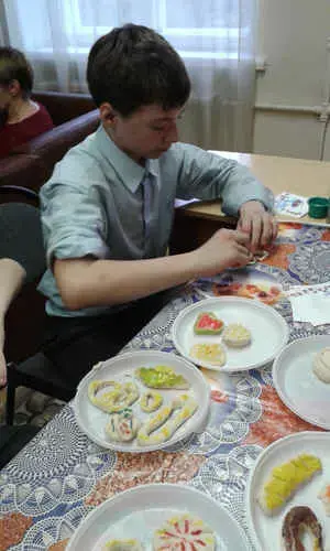 В конце клубного часа дети садятся за стол, где на тарелочках лежат кусочки соленого теста. Учитель показывает и вместе с детьми делает булочки, сушки, плетенки, пирожное, торты и др. изделия из теста, готовые изделия раскрашивают гуашью <Рисунок1>, <Рисунок2>, <Рисунок3>, <Рисунок4>.