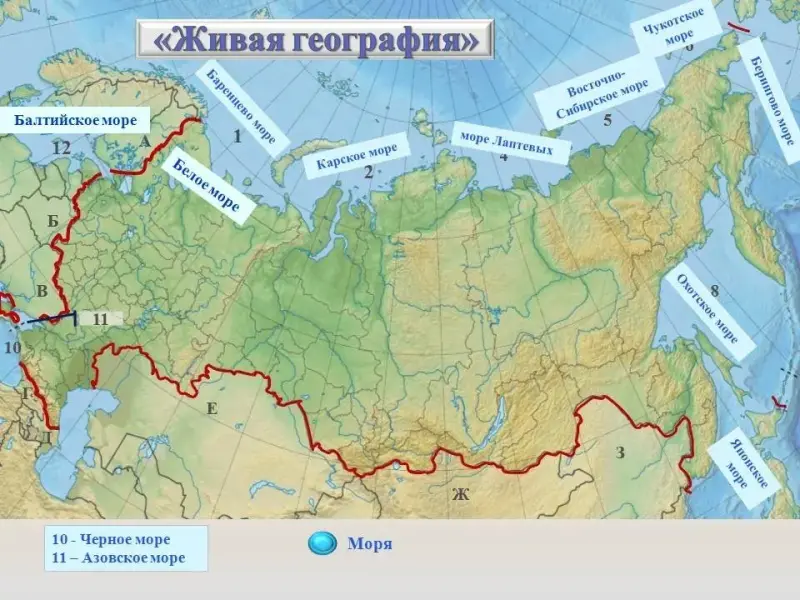 Слайд 4. 2 задание. (Ребята должны выйти и составить "живую" карту России. Ученики получают карточки с названием морей, омывающих территорию страны.