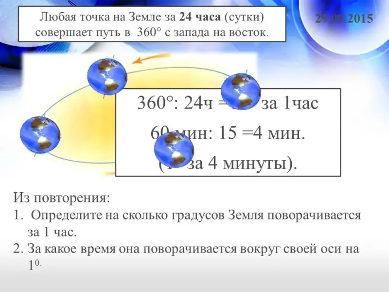 - Полный оборот (360`) Земля совершает за сутки, то есть за 24 часа. Значит, за 1 час Земля поворачивается на 15`, так как 360`: 24 = 15`. 1 час это 60 минут, 60 мин: 15` = 4 минуты. Таким образом, за 4 минуты Земля совершает поворот на 1`.