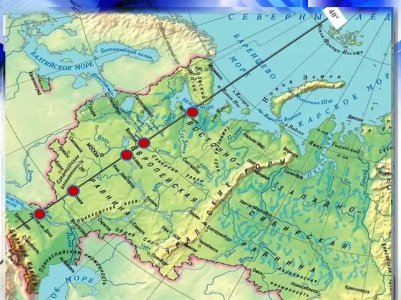 - На разных меридианах в один и тот же момент бывает резное время суток. Значит, сутки начинаются одновременно на всём меридиане, каждый меридиан имеет свое местное время. Местное время зависит от географической долготы. (Города на 40 меридиане) Архангельск-Вологда-Ярославль-Воронеж-Ростов-на-Дону)