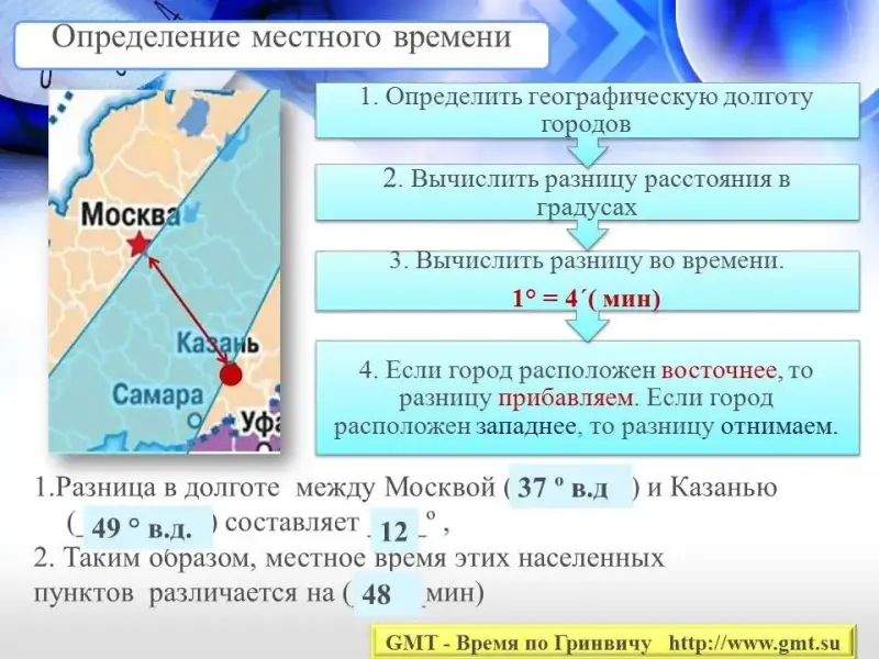 (Если город расположен восточнее, то разницу прибавляем)