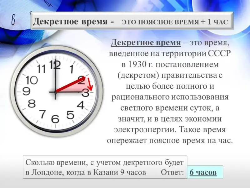 В действительности разница во времени между Москвой и, например, Берлином или Парижем составляет не один, а два часа. Это обусловлено тем, что на всей территории России действует декретное время, отличающееся на один час от поясного. В 1930 г. постановлением (декретом) правительства стрелки часов были переведены на один час вперед по сравнению с поясным временем. Это было сделано с целью более полного использования светлого времени суток, а значит, и в целях экономии электроэнергии. Декретное время II часового пояса, где расположена Москва, называют московским временем. (Сколько времени, с учетом декретного будет в Лондоне, когда в Казани 9 часов. Ответ: 6 часов)