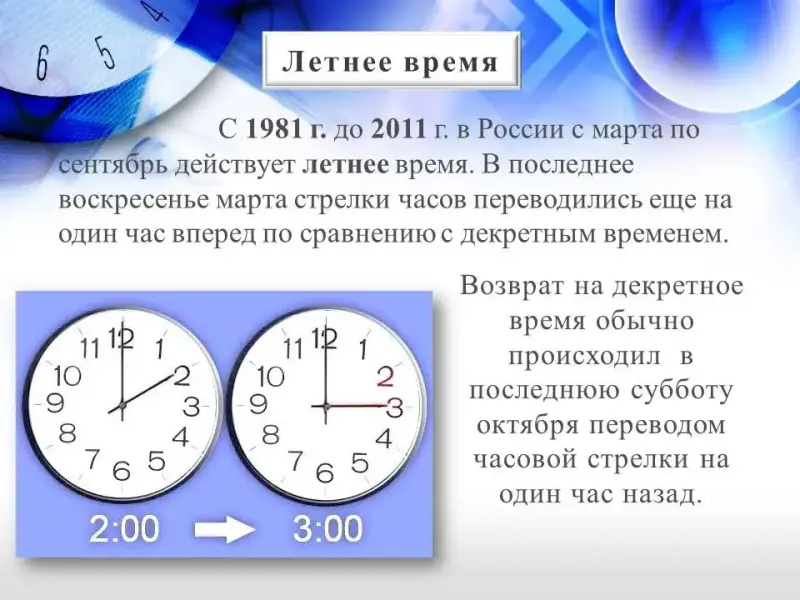 С 1981 г. в России с марта по сентябрь действует летнее время. В последнее воскресенье марта стрелки часов переводились еще на один час вперед по сравнению с декретным временем. С 2008 г. возврат на декретное время обычно происходил в последнюю субботу октября переводом часовой стрелки на один час назад. С октября 2011 года перевод на зимнее время не осуществлялось.