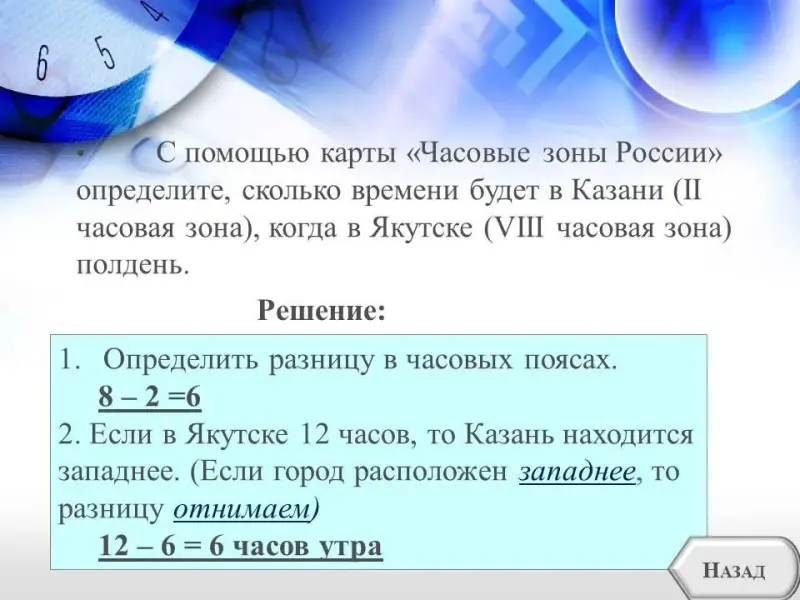 2. Если в Якутске 12 часов, то Казань находится западнее.