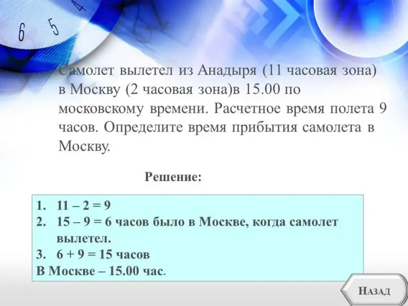 4. Самолет вылетел из Анадыря (11 часовая зона) в Москву (2 часовая зона) в 15.00 по московскому времени. Расчетное время полета 9 часов. Определите время прибытия самолета в Москву.