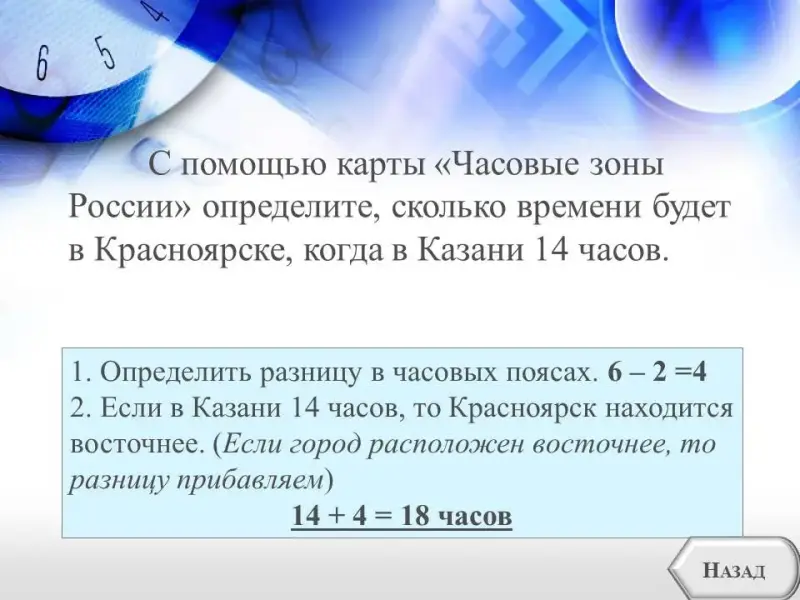 2. Если в Казани 14 часов, то Красноярск находится восточнее.