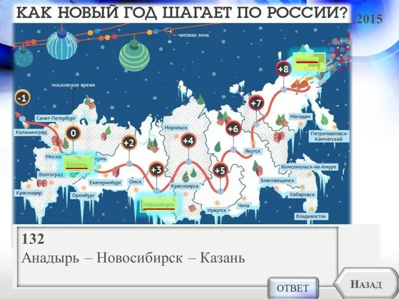 6. (ОГЭ - 9 кл) Расположите города России в той последовательности, в которой их жители встречают Новый год.