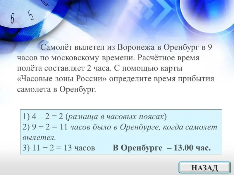 5. Самолёт вылетел из Воронежа (II часовая зона) в Оренбург (IV часовая зона) в 9 часов по московскому времени. Расчётное время полёта составляет 2 часа. С помощью карты "Часовые зоны России" определите, сколько времени будет в Оренбурге, когда самолёт приземлится.