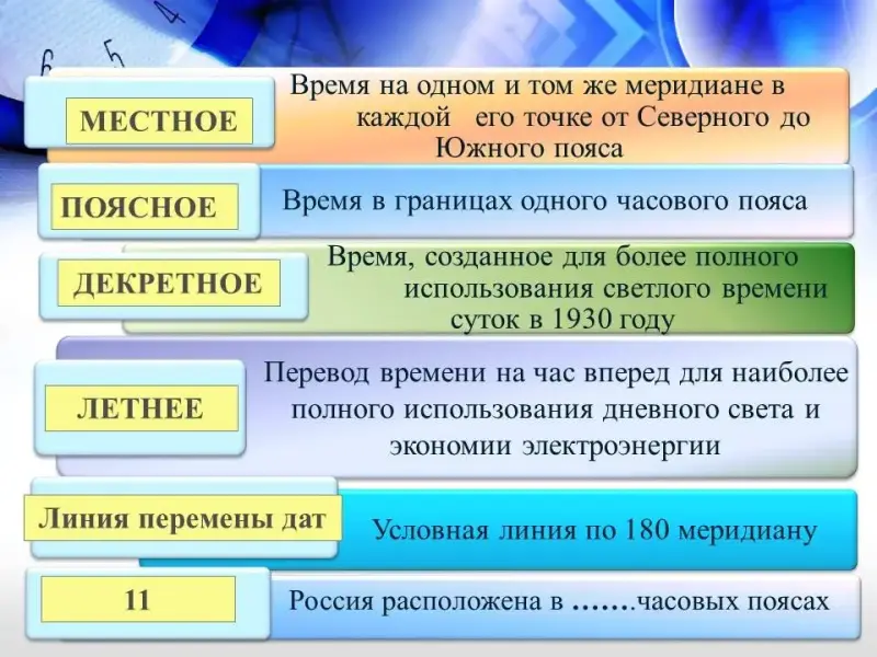 - Образовательная - сформировать знания о поясном, декретном и местном времени; дать понятие "часовые пояса".