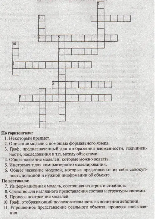 - по вертикали: 7. таблица, 8.граф, 9. моделирование, 10. схема, 11. модель.)