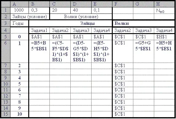 В ячейки B5 - F5 присваиваем $A$1 - начальная численность зайцев, N30.