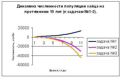 Условие: Рассчитать, какова будет численность популяции зайца через 1,3,5 и 10 лет при полном отсутствии волков. Отобразить изменения численности зайцев в течение данного периода графически.