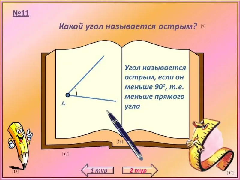11. Какой угол называется острым? (Угол называется острым, если он меньше 90о, т.е. меньше прямого угла)