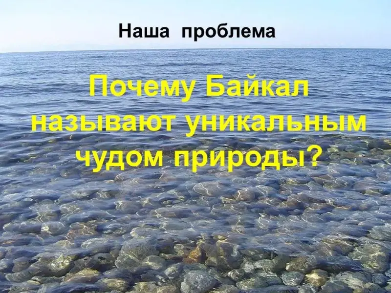 Не случайно Байкал включён в список Всемирного природного наследия Юнеско в 1996 году как уникальный ПК планеты. Он принадлежит не только России. Байкал принадлежит всему человечеству. (слайд 2) Вот перед вами высказывание Л.С.Берга: "Байкал - это уникальное явление нашей планеты, чудо природы во всех отношениях". На основе данного высказывания определите проблему, над которой мы будем сегодня работать и, которая была бы вам интересна. Как бы вы её обозначили? Ваши предложения? (Почему Байкал называют уникальным чудом природы?) (слайд 3) |