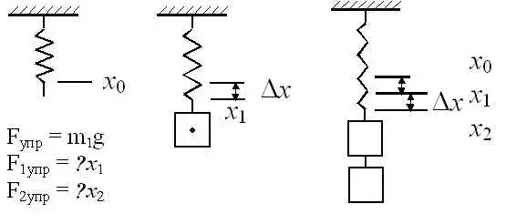 х - удлинение, k - жесткость пружины.
