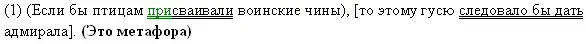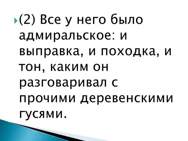 (1) Если бы птицам присваивали воинские чины, то этому гусю следовало бы дать адмирала. (2) Все у него было адмиральское: и выправка, и походка, и тон, каким он разговаривал с прочими деревенскими гусями.
