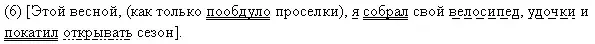 (6) Этой весной, как только пообдуло проселки, я собрал свой велосипед, удочки и покатил открывать сезон. (7) Белый гусь уже был там. (8) Заметив меня, он пригнул шею к траве и с угрожающим шипением двинулся навстречу. (9) Я едва успел отгородиться велосипедом.