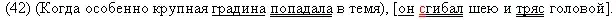 (40) Белый гусь сидел, высоко вытянув шею. (41) Град бил его по голове, гусь вздрагивал и прикрывал глаза. (42) Когда особенно крупная градина попадала в темя, он сгибал шею и тряс головой. (43) Потом снова выпрямлялся и все поглядывал на тучу, осторожно склоняя голову набок. (44) Под его широко раскинутыми крыльями тихо копошилась дюжина гусят.