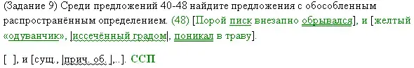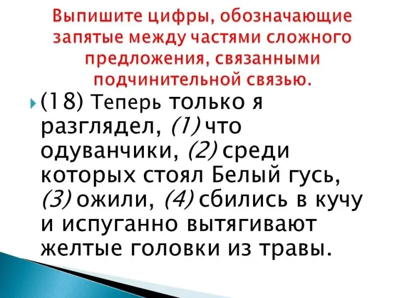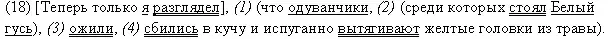 (18) Теперь только я разглядел, (1) что одуванчики, (2) среди которых стоял Белый гусь, (3) ожили, (4) сбились в кучу и испуганно вытягивают желтые головки из травы.