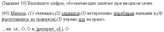 (64) Один гусенок, с темной ленточкой на спине, неуклюже переставляя широкие кривые лапки, пытался взобраться на крыло гусака. (65) Но всякий раз, не удержавшись, кубарем летел в траву. (66) Малыш, (1) очевидно,(2) сердился,(3) нетерпеливо перебирал лапками и,(4) выпутавшись из травинок,(5) упрямо лез на крыло. (67) Наконец гусёнок вскарабкался на спину своего отца и замер. (68) Он никогда не забирался так высоко. (69) Перед ним открылся удивительный мир, полный сверкающих трав и солнца.