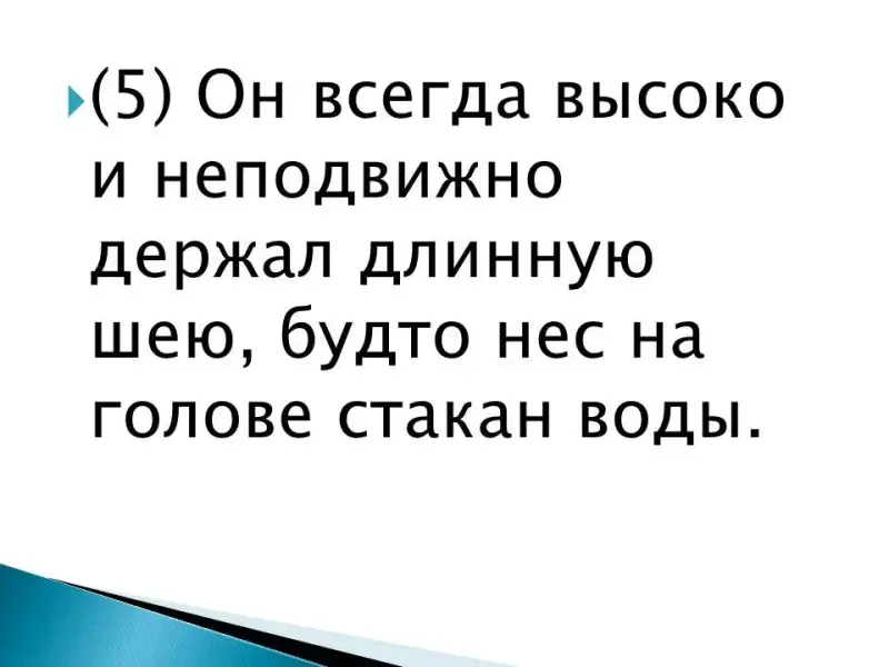 (3) Ходил он важно, обдумывая каждый шаг. (4) Этот гусь никогда не бежал, даже если за ним припустит собака. (5) Он всегда высоко и неподвижно держал длинную шею, будто нес на голове стакан воды.