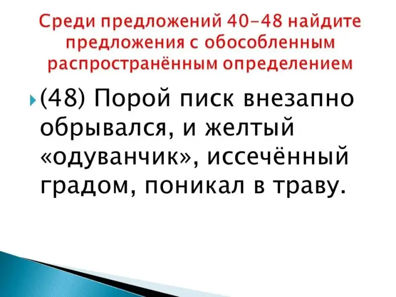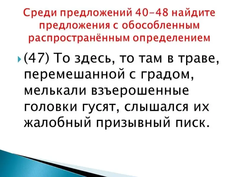 (45) Туча свирепствовала с нарастающей силой. (46) Гуси не выдержали и побежали. (47) То здесь, то там в траве, перемешанной с градом, мелькали взъерошенные головки гусят, слышался их жалобный призывный писк. (48) Порой писк внезапно обрывался, и желтый "одуванчик", иссечённый градом, поникал в траву.