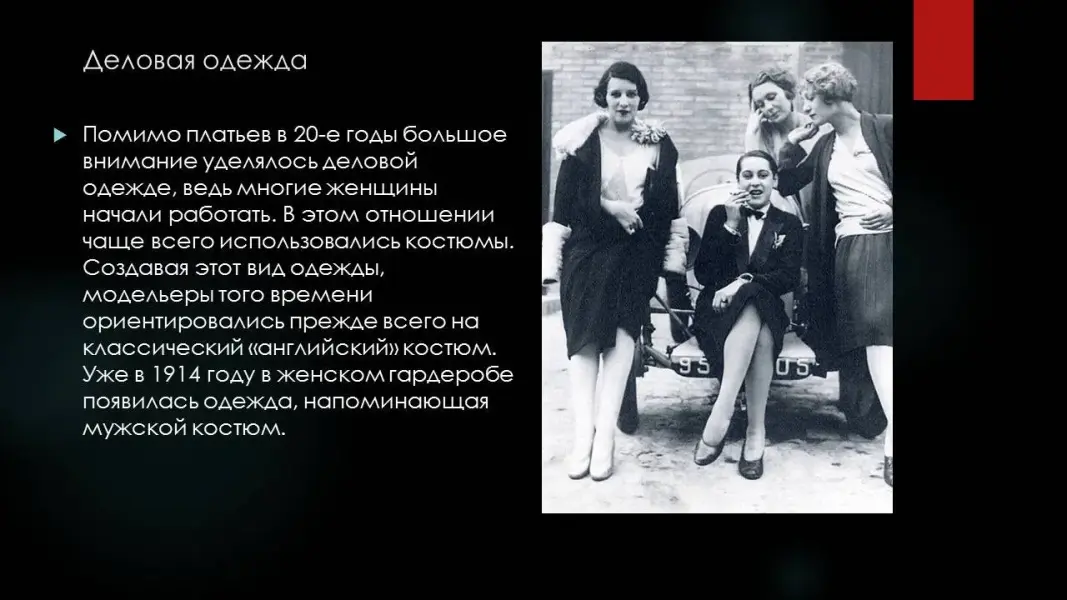 Помимо платьев в 20-е годы большое внимание уделялось деловой одежде, ведь многие женщины начали работать. В этом отношении чаще всего использовались костюмы. Создавая этот вид одежды, модельеры того времени ориентировались прежде всего на классический "английский" костюм. Уже в 1914 году в женском гардеробе появилась одежда, напоминающая мужской костюм. Облик женского костюма 20-х обладал строгим характером с женственными элементами. Например, полочки жакета имели низкое расположение застёжки или же вообще были без неё. В форме воротников и лацканов, линии борта и других элементов кроя модельеры 20-х придерживались чёткости и отточенности. В 1920-х появились не только строгие костюмы, но и отдельные жакеты, которые предлагались как дополнение к юбкам или платьям. Такие жакеты можно было носить не только с платьями из плотной ткани, но и с платьями из шифона (Презентация 1. ppt. 4 слайд).